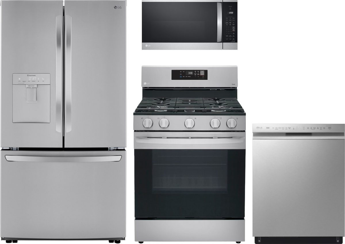 LG 4 Piece Stainless Steel Kitchen Package with a french door refrigerator, freestanding gas range, built in dishwasher, and over the range microwave.Read More